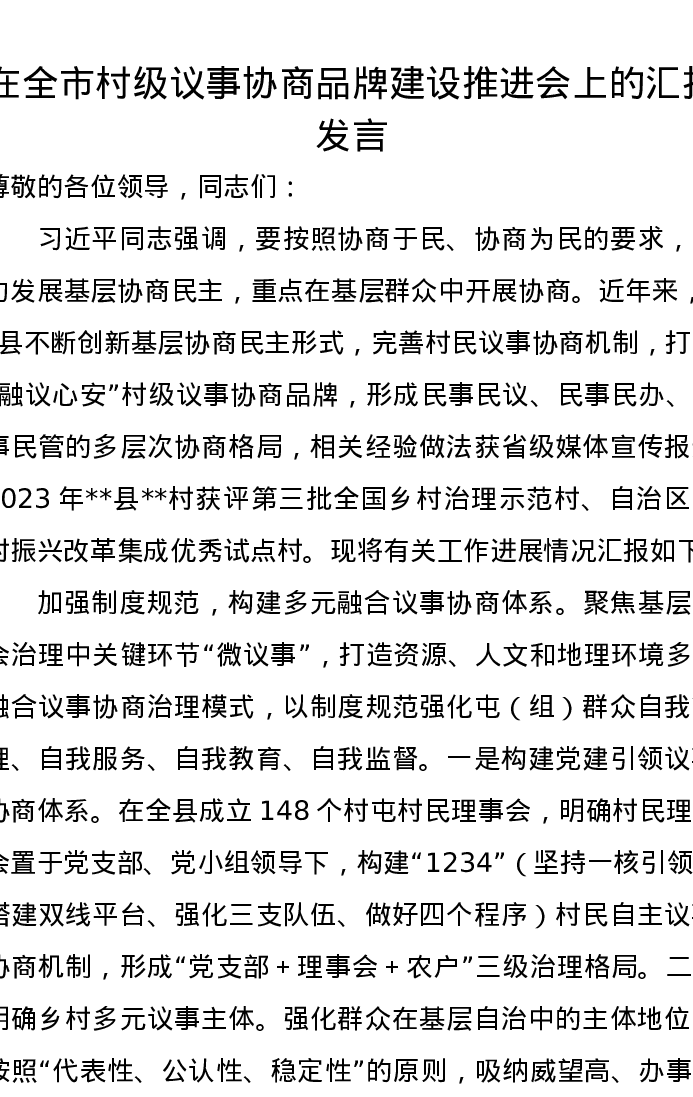 在全市村级议事协商品牌建设推进会上的汇报发言