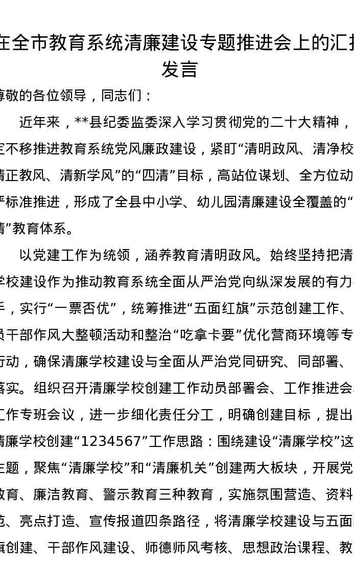 在全市教育系统清廉建设专题推进会上的汇报发言
