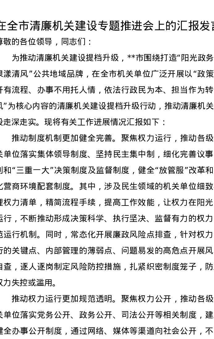 在全市清廉机关建设专题推进会上的汇报发言