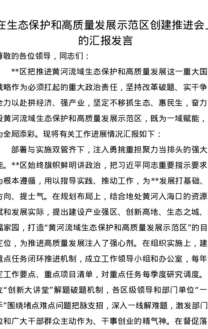 在生态保护和高质量发展示范区创建推进会上的汇报发言