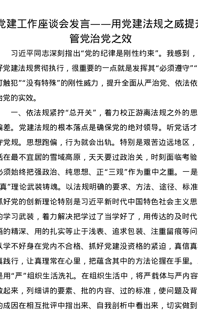 党建工作座谈会发言——用党建法规之威提升管党治党之效