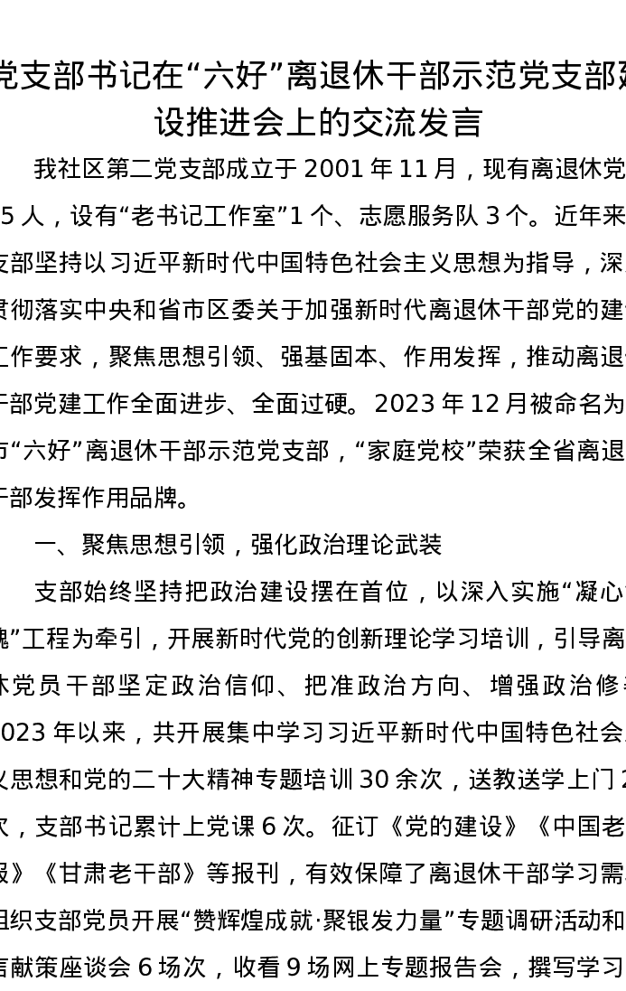 党支部书记在“六好”离退休干部示范党支部建设推进会上的交流发言