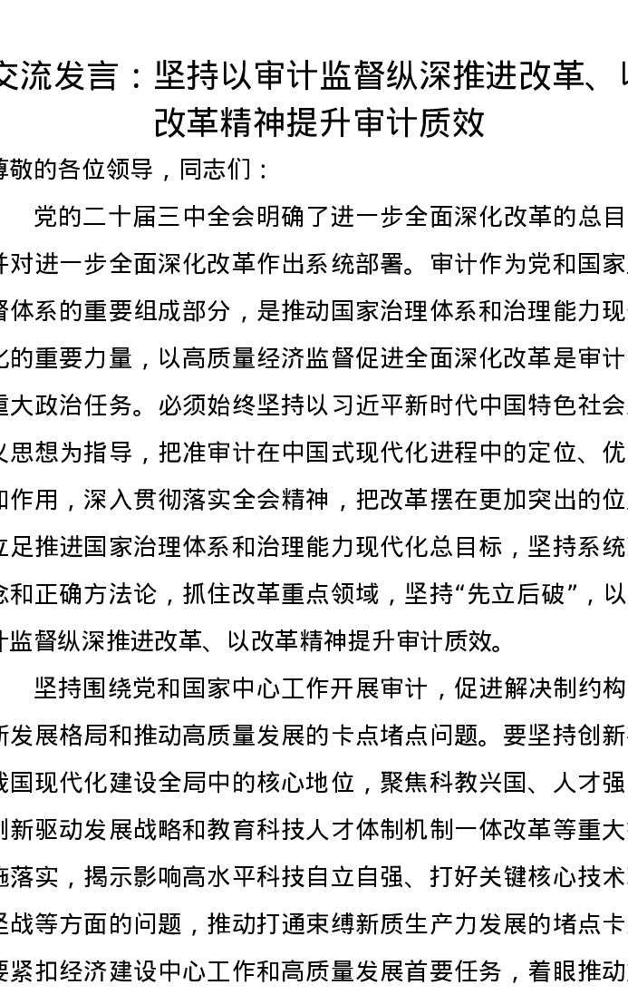 交流发言:坚持以审计监督纵深推进改革、以改革精神提升审计质效