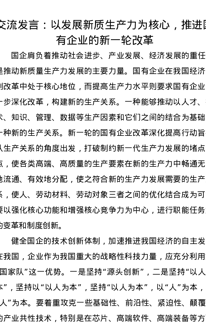 交流发言:以发展新质生产力为核心,推进国有企业的新一轮改革