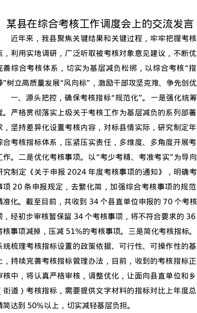 某县在综合考核工作调度会上的交流发言