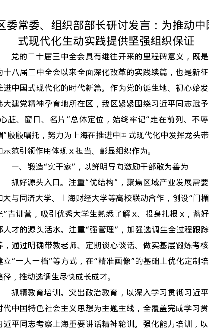区委常委、组织部部长研讨发言:为推动中国式现代化生动实践提供坚强组织保证