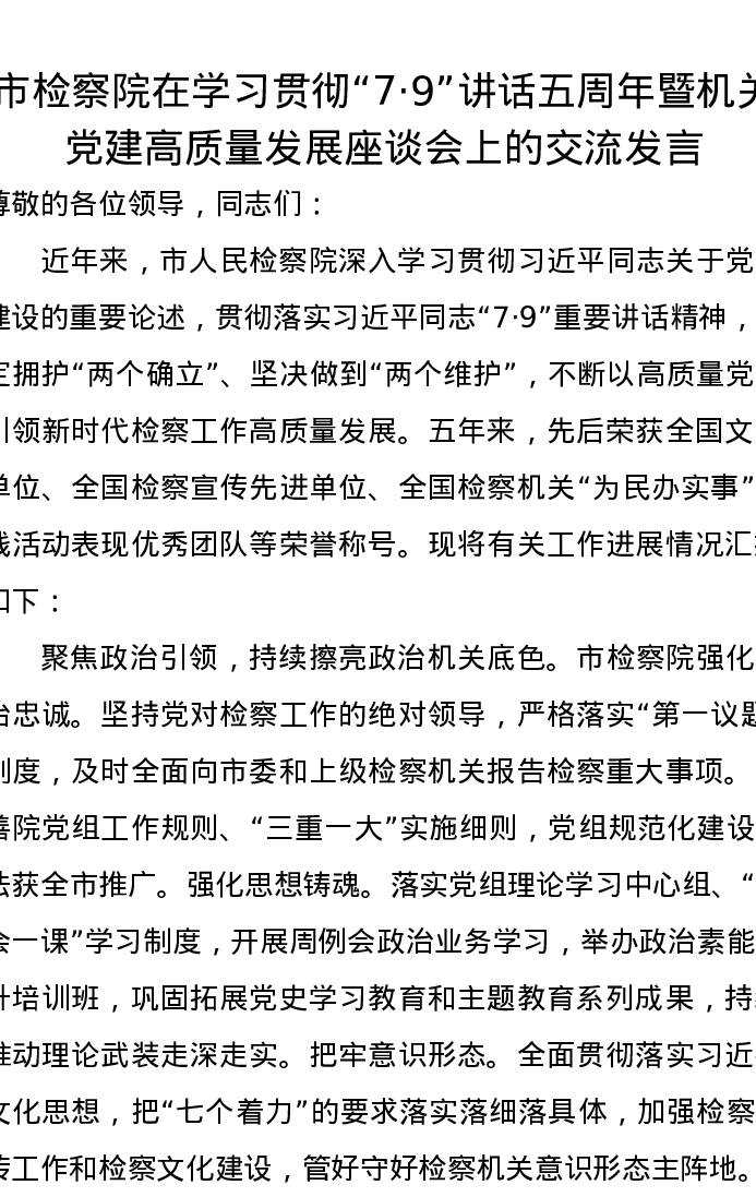 市检察院在学习贯彻“7·9”讲话五周年暨机关党建高质量发展座谈会上的交流发言