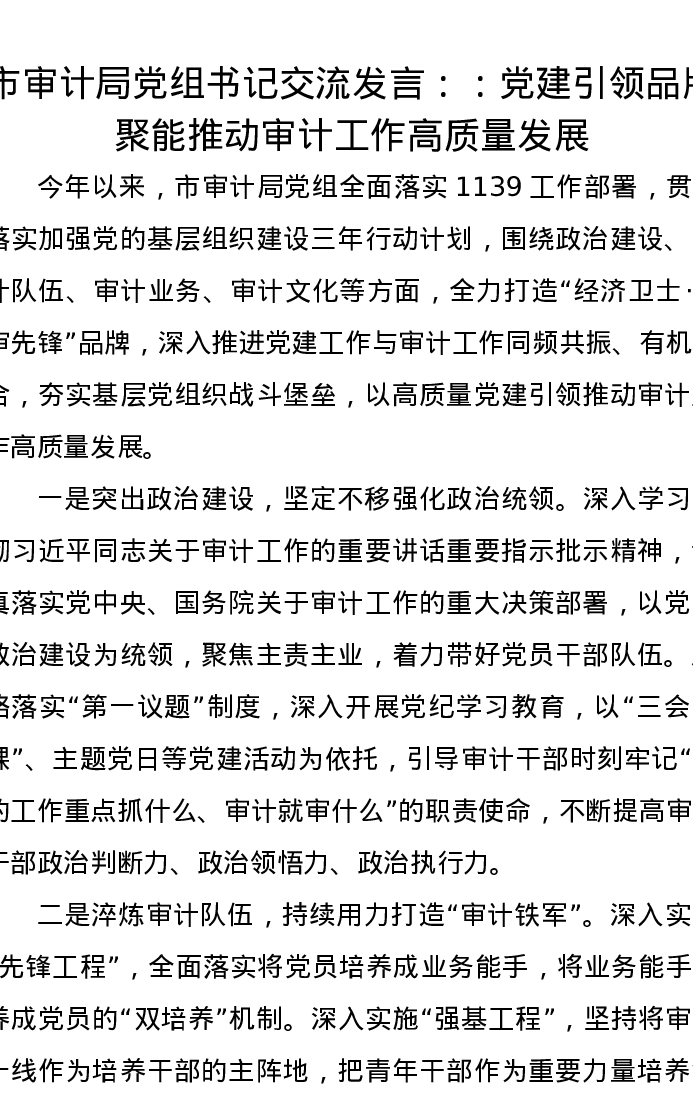 市审计局党组书记交流发言::党建引领品牌聚能推动审计工作高质量发展