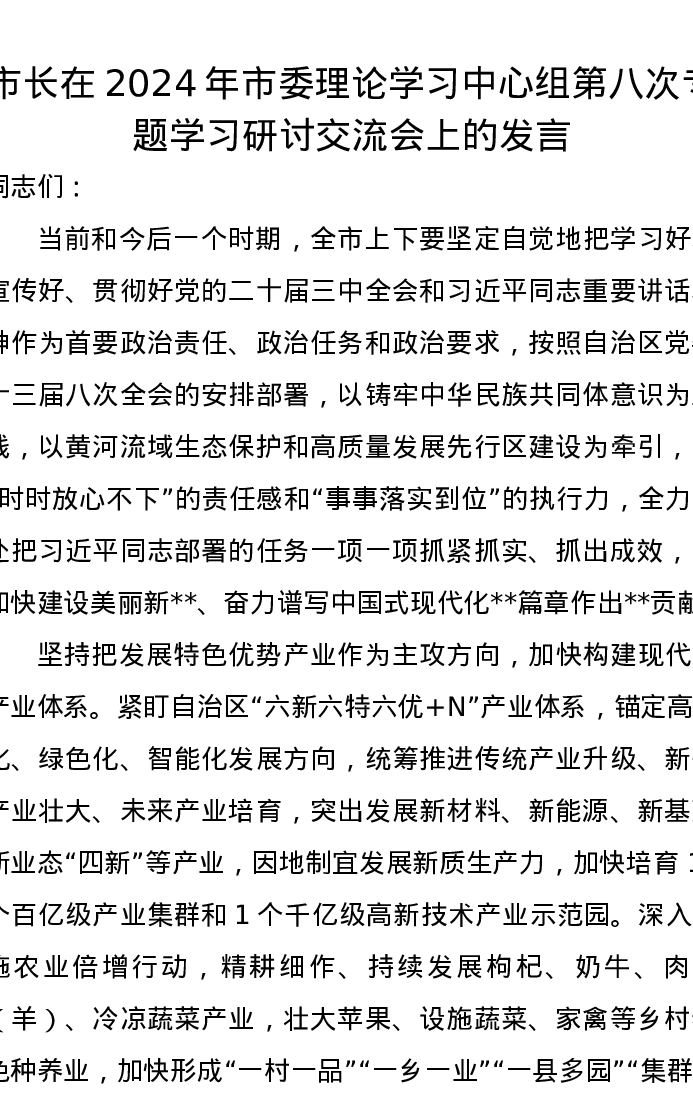 市长在2024年市委理论学习中心组第八次专题学习研讨交流会上的发言