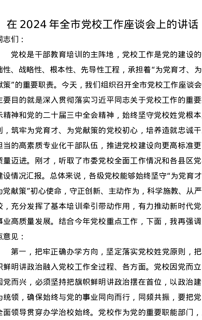 在2024年全市党校工作座谈会上的讲话