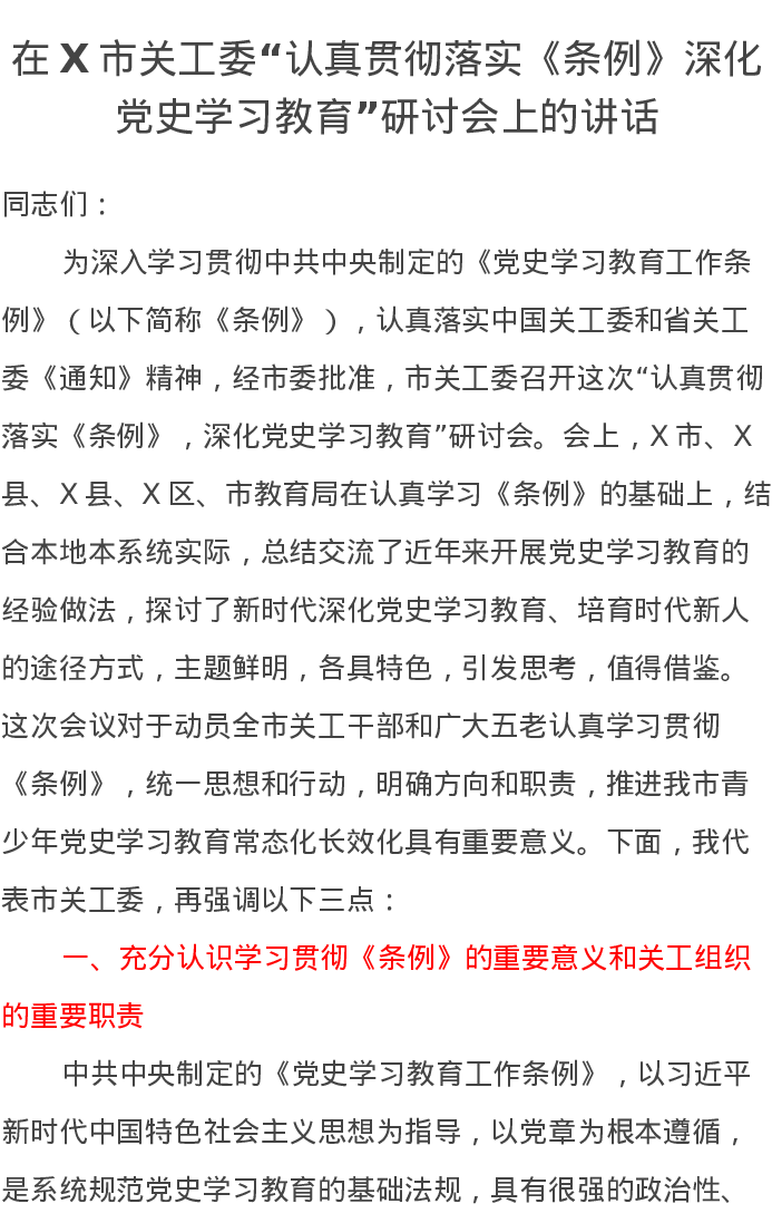 在X市关工委“认真贯彻落实《条例》深化党史学习教育”研讨会上的讲话