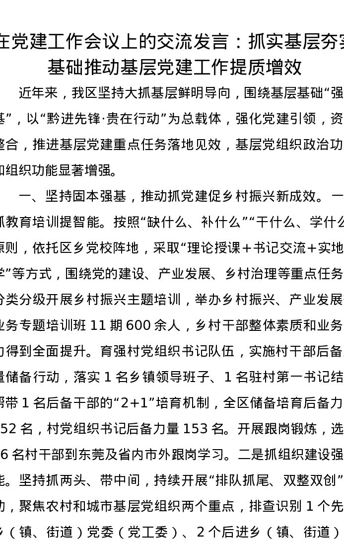 在党建工作会议上的交流发言:抓实基层夯实基础推动基层党建工作提质增效
