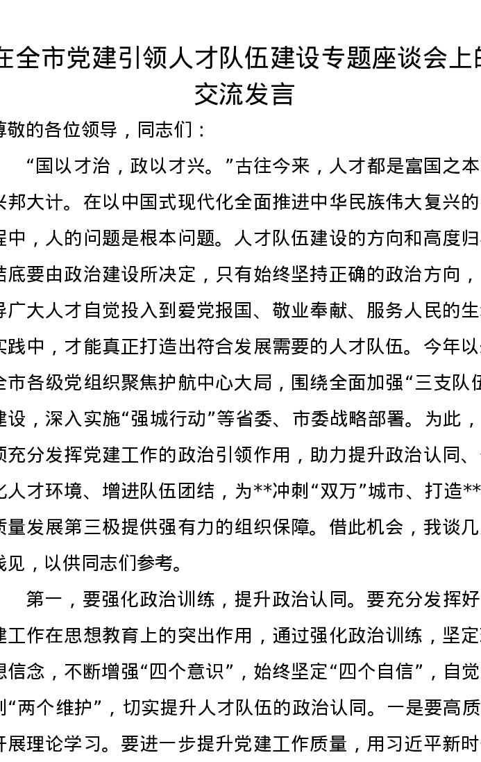 在全市党建引领人才队伍建设专题座谈会上的交流发言