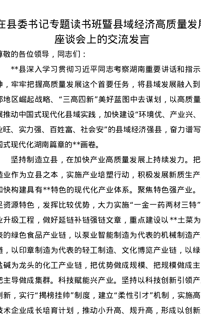 在县委书记专题读书班暨县域经济高质量发展座谈会上的交流发言