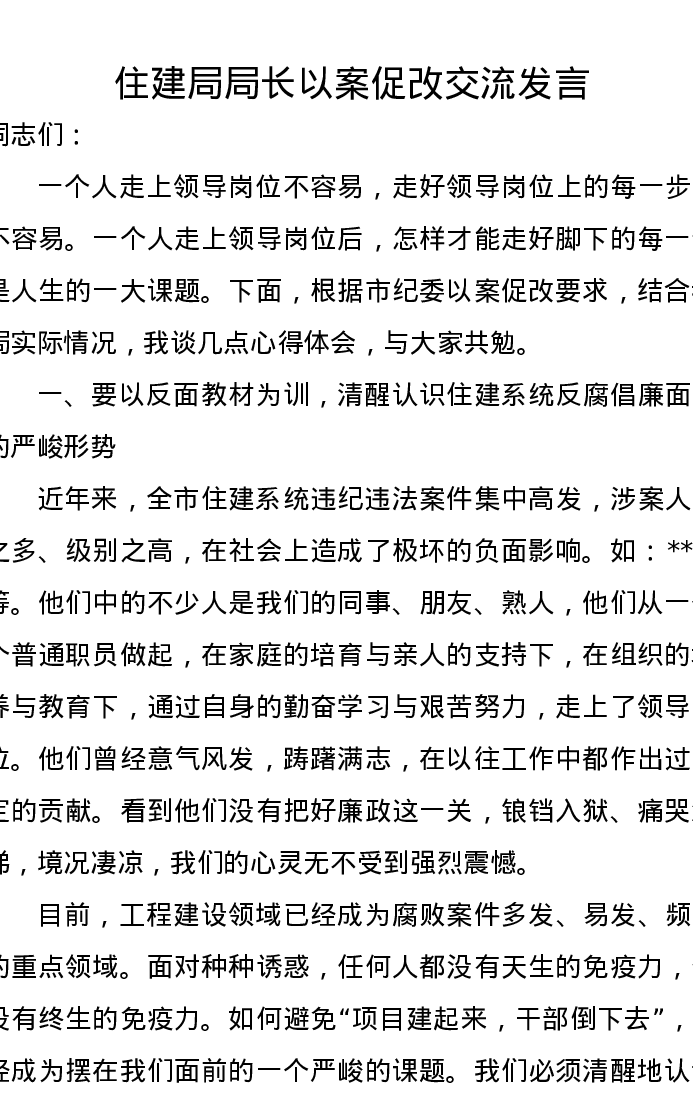 住建局局长以案促改交流发言
