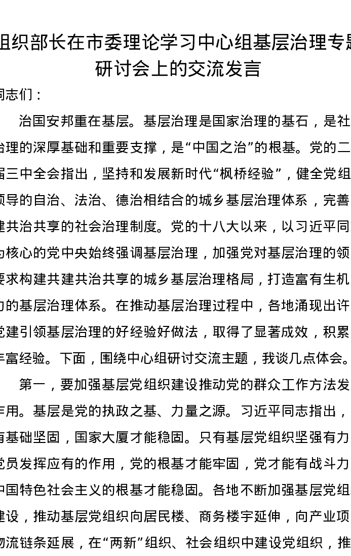 组织部长在市委理论学习中心组基层治理专题研讨会上的交流发言