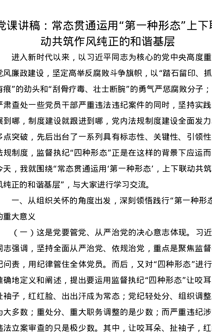 党课讲稿:常态贯通运用“第一种形态”上下联动共筑作风纯正的和谐基层