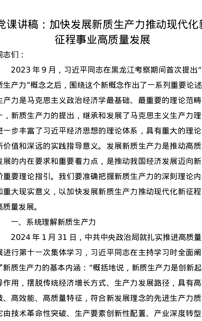 党课讲稿:加快发展新质生产力推动现代化新征程事业高质量发展