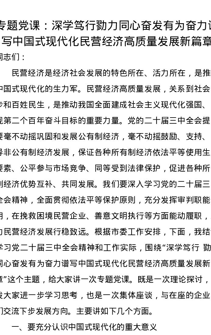 专题党课:深学笃行,勠力同心,奋发有为奋力谱写中国式现代化民营经济高质量发展新篇章
