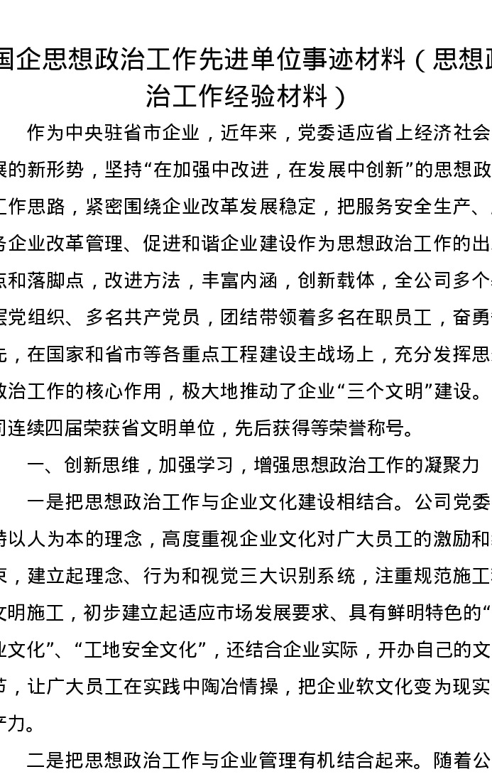 国企思想政治工作先进单位事迹材料(思想政治工作经验材料)