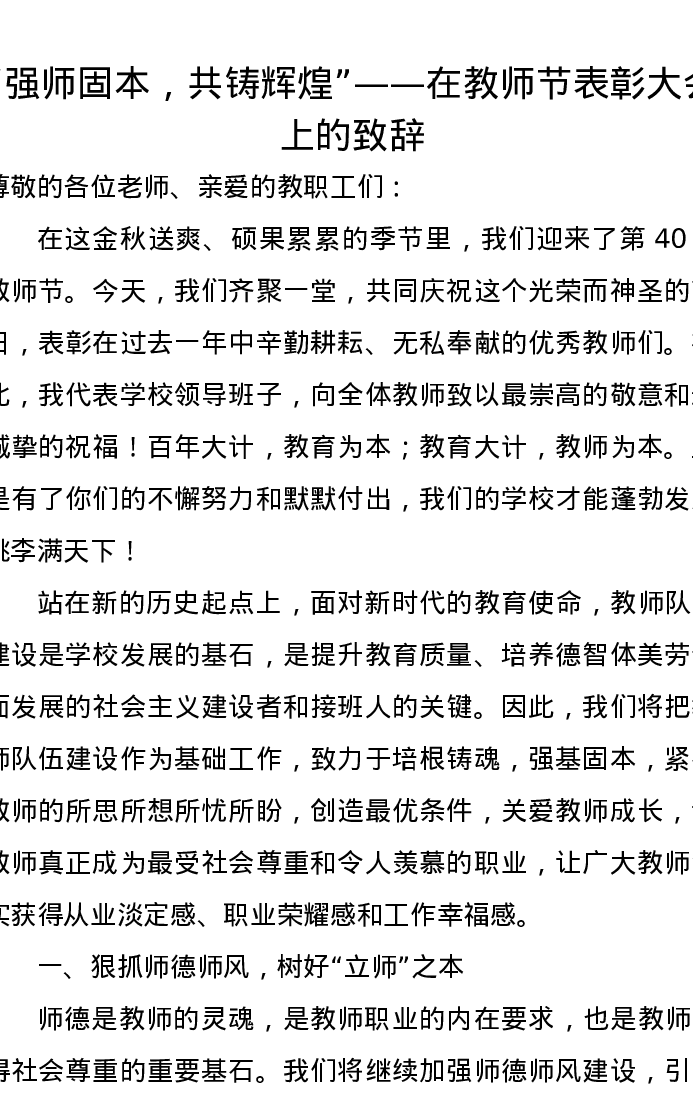 “强师固本,共铸辉煌”——在教师节表彰大会上的致辞