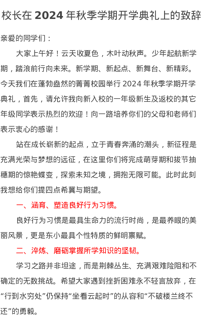 校长在2024年秋季学期开学典礼上的致辞