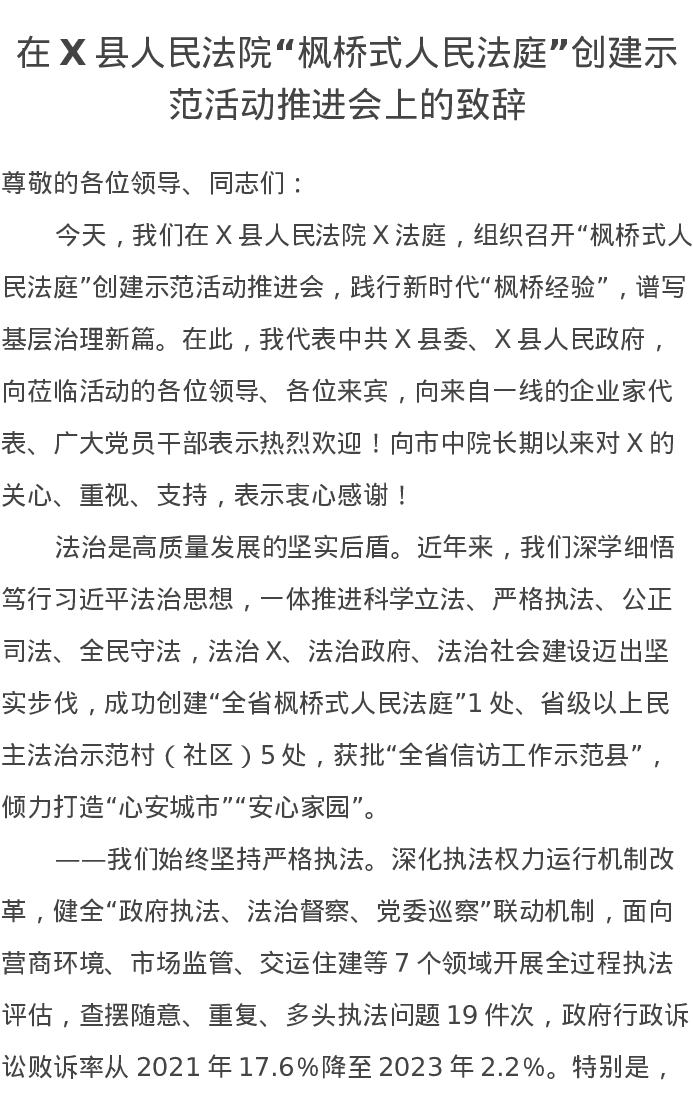 在X县人民法院“枫桥式人民法庭”创建示范活动推进会上的致辞