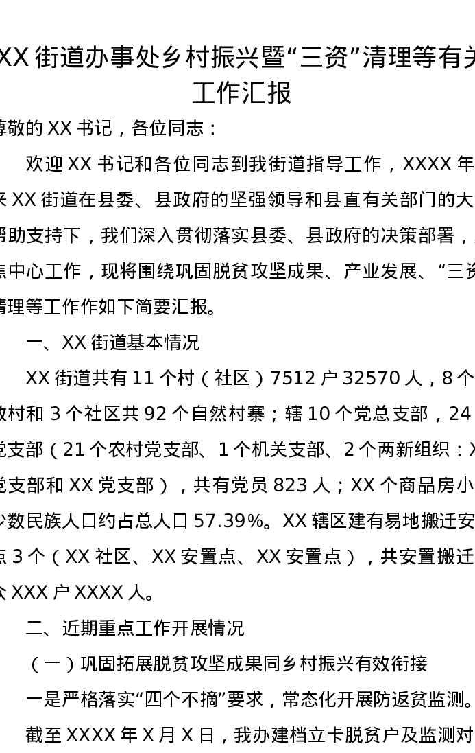 XX街道办事处乡村振兴暨“三资”清理等有关工作汇报