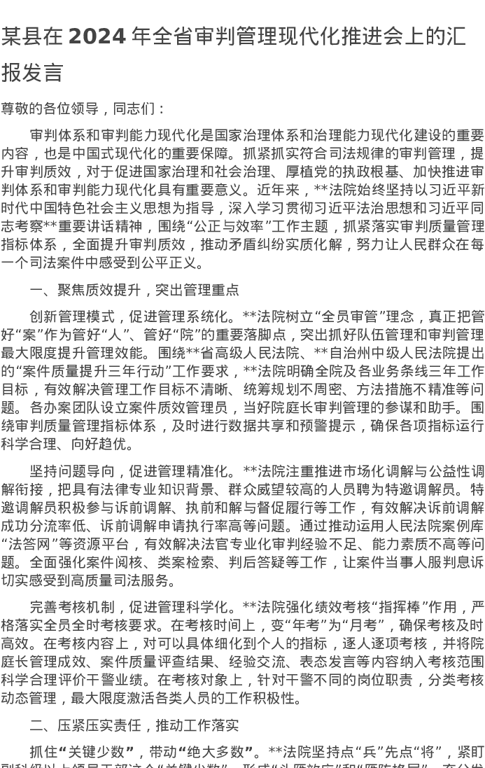 某县在2024年全省审判管理现代化推进会上的汇报发言