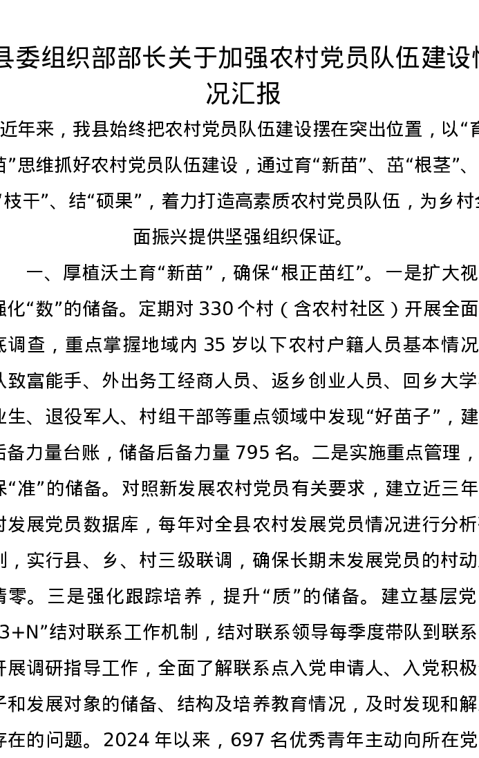 县委组织部部长关于加强农村党员队伍建设情况汇报