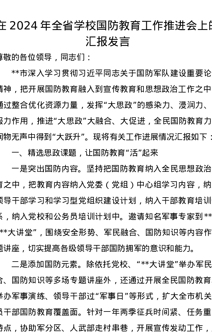 在2024年全省学校国防教育工作推进会上的汇报发言