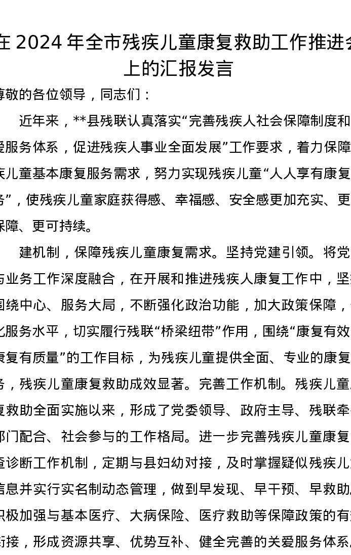 在2024年全市残疾儿童康复救助工作推进会上的汇报发言