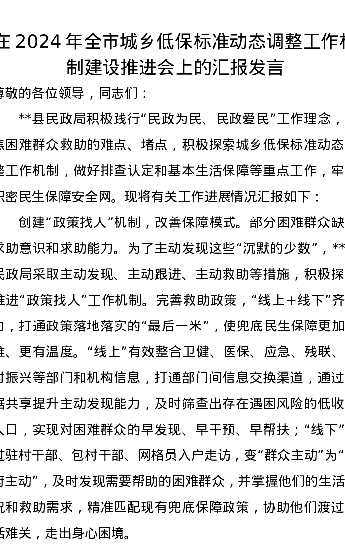 在2024年全市城乡低保标准动态调整工作机制建设推进会上的汇报发言