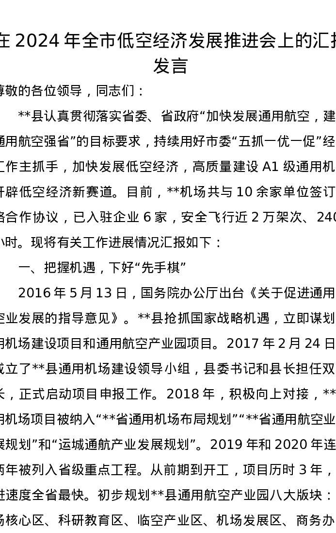 在2024年全市低空经济发展推进会上的汇报发言