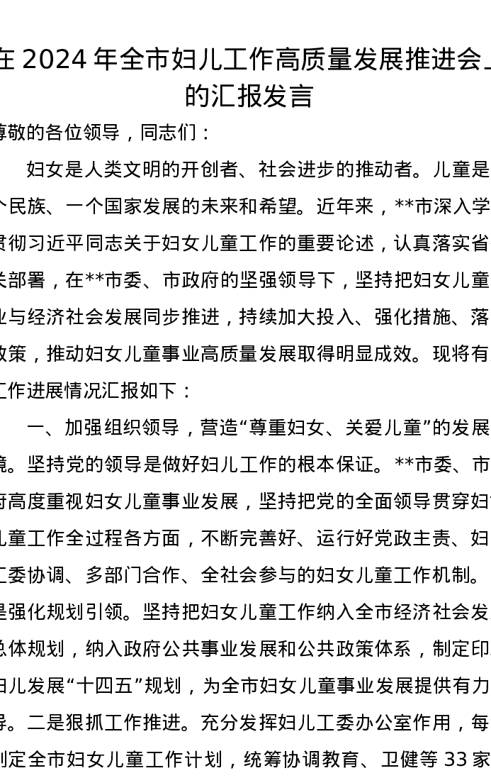 在2024年全市妇儿工作高质量发展推进会上的汇报发言