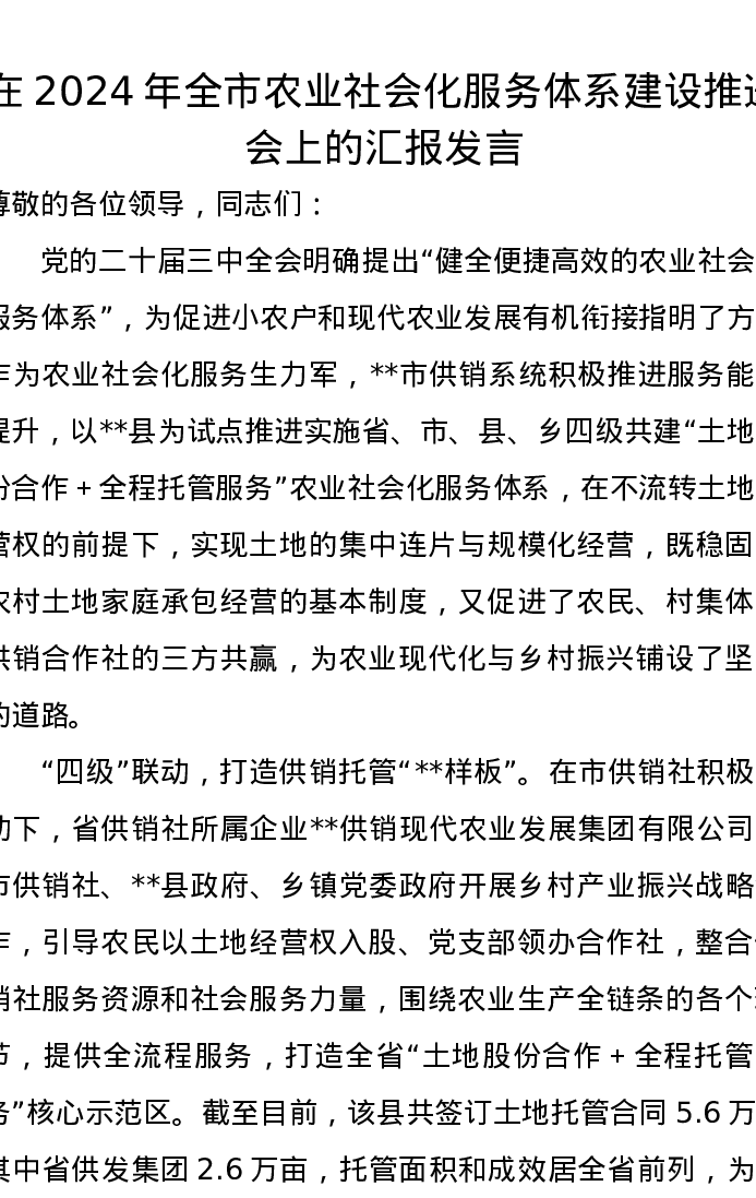 在2024年全市农业社会化服务体系建设推进会上的汇报发言
