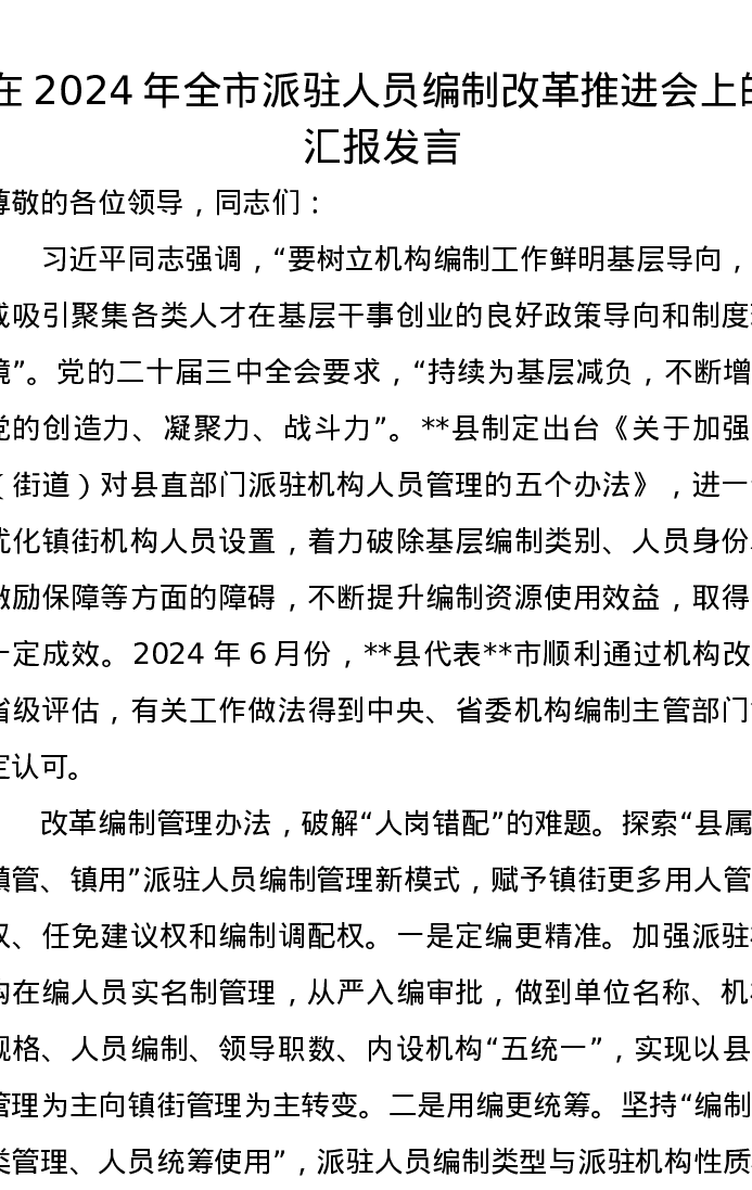 在2024年全市派驻人员编制改革推进会上的汇报发言