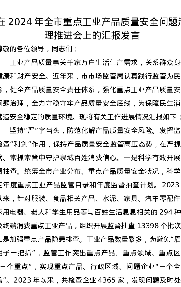 在2024年全市重点工业产品质量安全问题治理推进会上的汇报发言