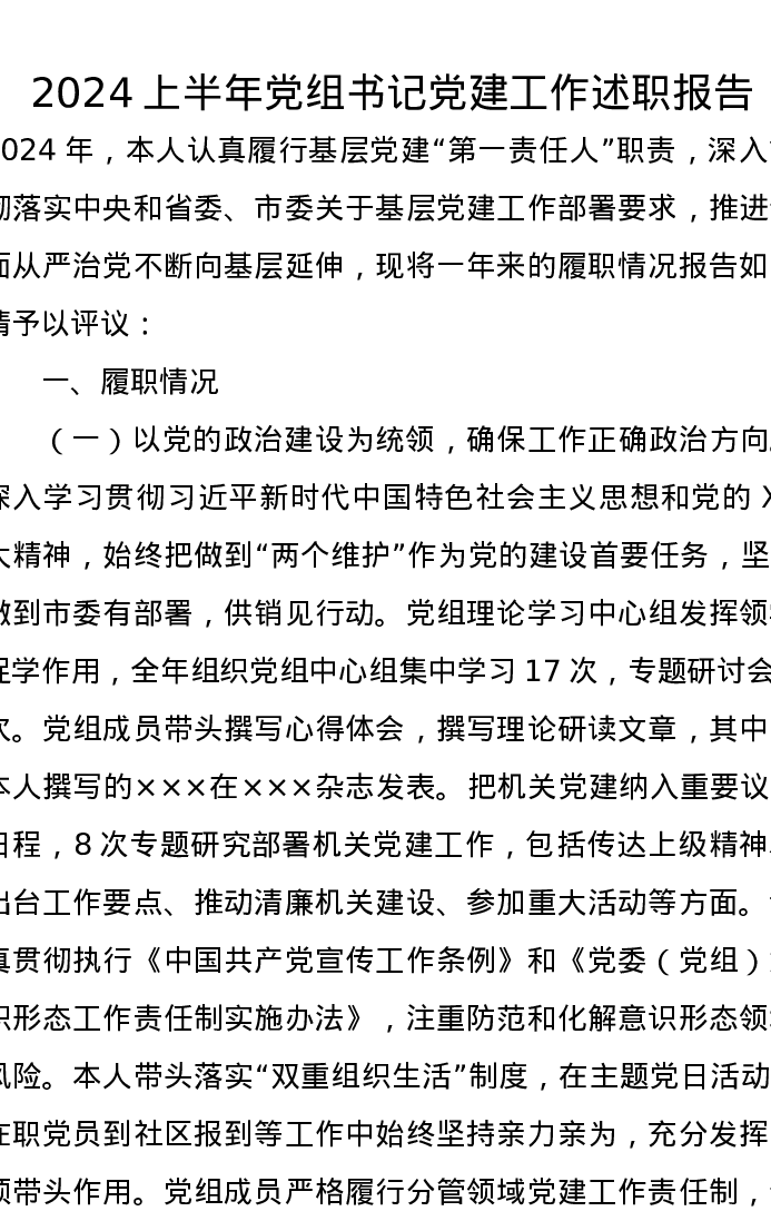 2024上半年党组书记党建工作述职报告
