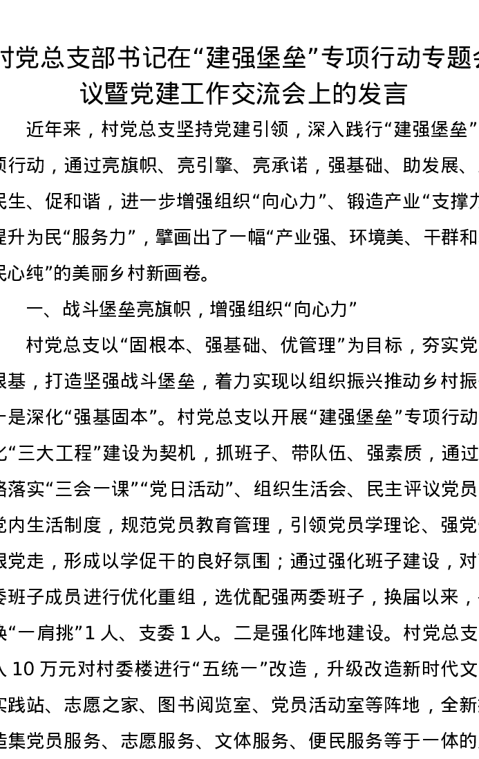村党总支部书记在“建强堡垒”专项行动专题会议暨党建工作交流会上的发言