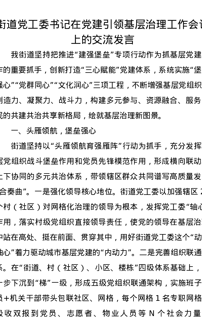 街道党工委书记在党建引领基层治理工作会议上的交流发言