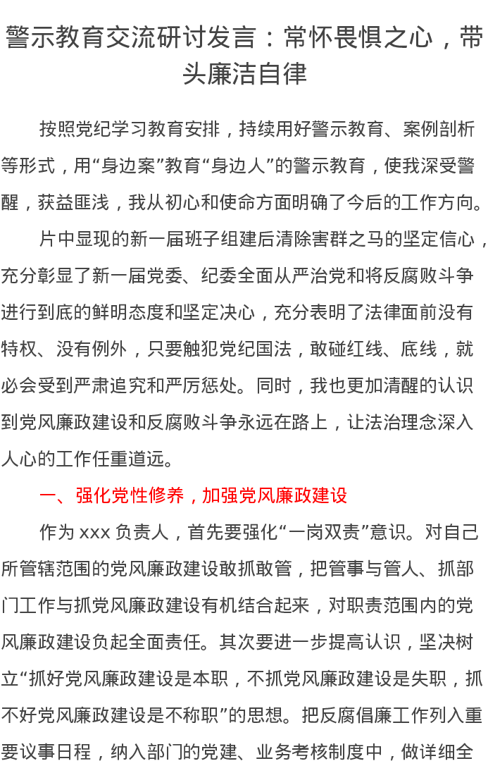 警示教育交流研讨发言:常怀畏惧之心,带头廉洁自律