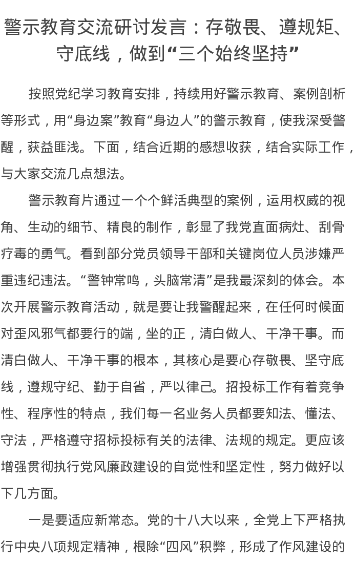 警示教育交流研讨发言:存敬畏、遵规矩、守底线,做到“三个始终坚持”