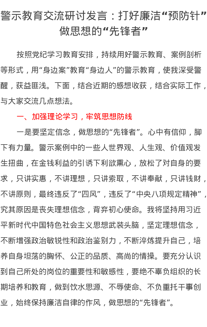 警示教育交流研讨发言:打好廉洁“预防针”,做思想的“先锋者”