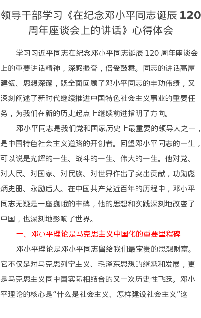 领导干部学习《在纪念邓小平同志诞辰120周年座谈会上的讲话》心得体会