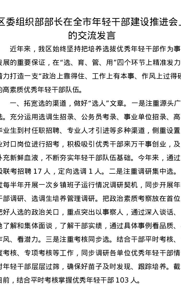 区委组织部部长在全市年轻干部建设推进会上的交流发言