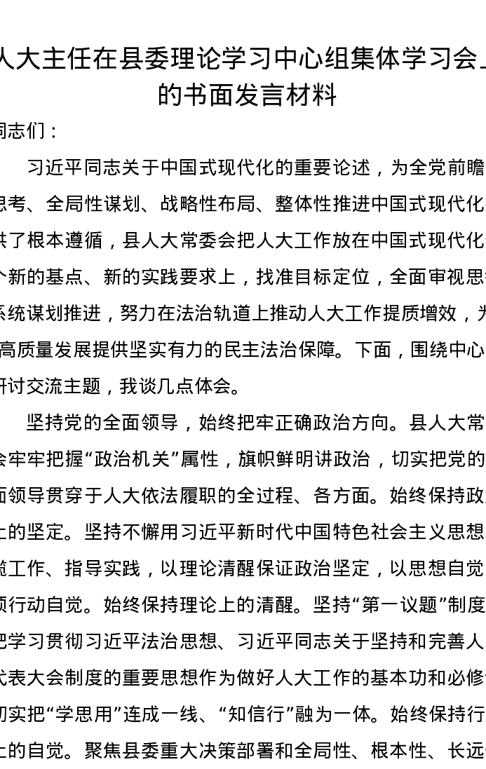 人大主任在县委理论学习中心组集体学习会上的书面发言材料