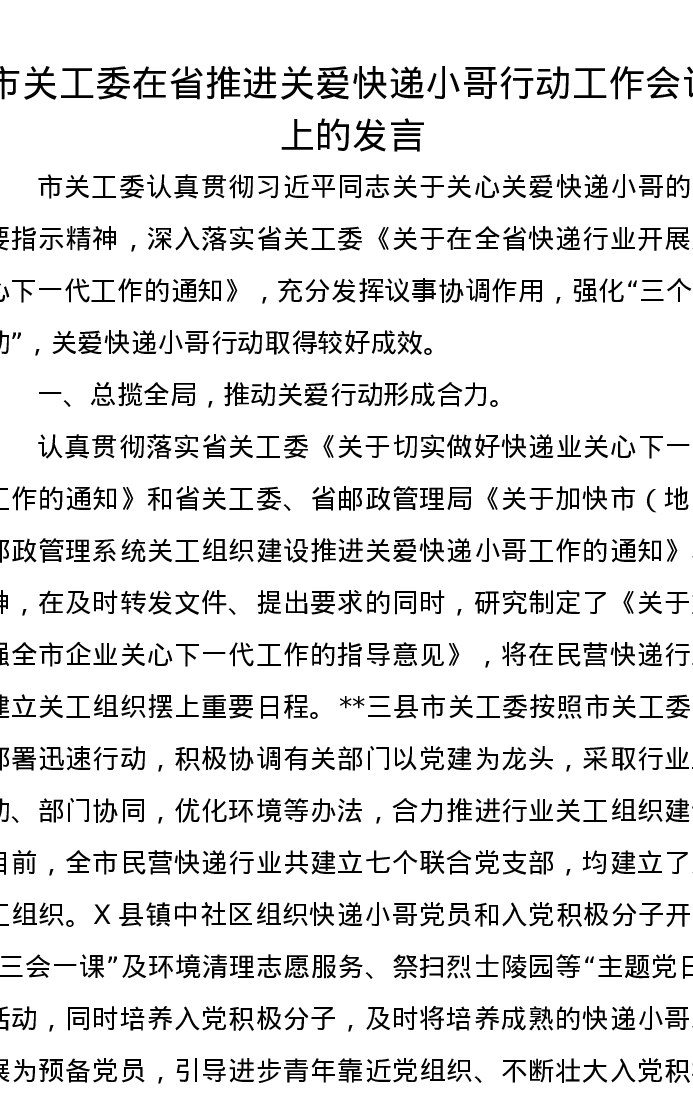 市关工委在省推进关爱快递小哥行动工作会议上的发言
