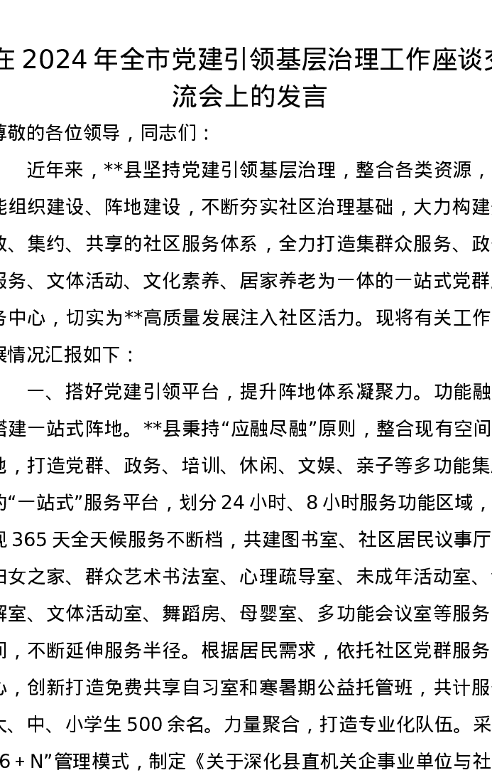 在2024年全市党建引领基层治理工作座谈交流会上的发言