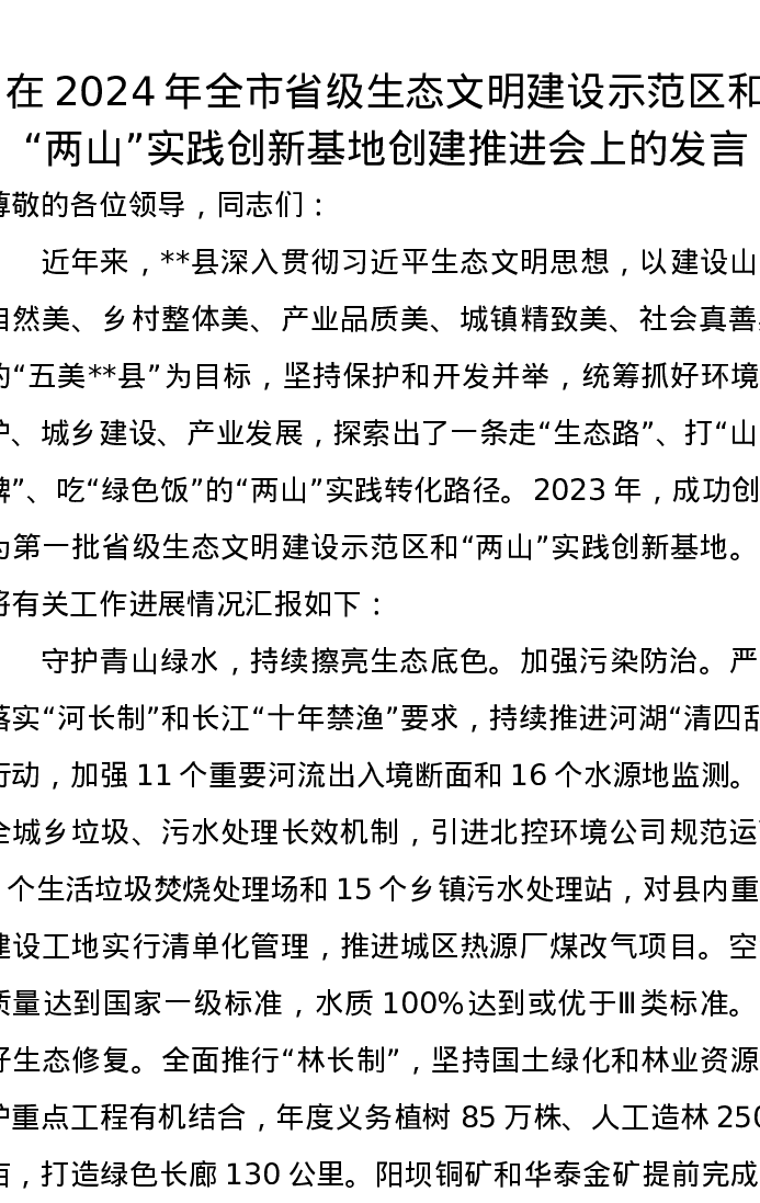 在2024年全市省级生态文明建设示范区和“两山”实践创新基地创建推进会上的发言